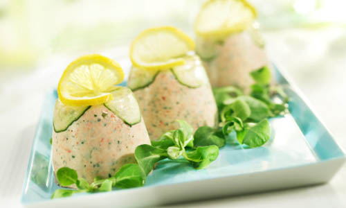 - 4 Förmchen (á ca. 200 ml Inhalt) mit kaltem Wasser ausspülen und je 3 Scheiben Gurke hineinlegen. Die Lachscreme darauf verteilen, glatt streichen und ca. 2 Stunden kalt stellen.