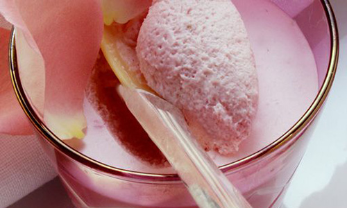 - Para la mousse, empape las láminas de gelatina en el agua fría (o prepare la gelatina en polvo según las instrucciones) Triture las frambuesas y tamícelas. Mézclelas con el azúcar, el azúcar de vainilla y el agua de rosas. Colocar la gelatina en un una pequeña cazuela y hervir a fuego lento. Revolver inmediatamente de dos a tres cucharadas soperas de puré de frambuesa y a continuación mezclar con el puré de frambuesa sobrante. Refrigerar hasta que la mezcla empiece a espesar. Batir la crema y verterla. Enfriar en la nevera entre dos y tres horas.