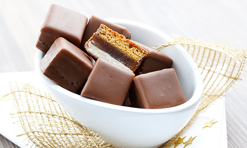 - Coupez le chocolat et le beurre de coco en petits morceaux et mettez-les dans un bol. Laissez fondre au bain-marie en remuant de temps en temps. Découpez le gâteau en carrés (4x2 cm) et enrobez-les de glaçage. Laissez refroidir.
