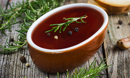 4. Condire con sale e pepe. Tagliare il filetto di manzo a fettine sottili. Prendere ¼ del brodo e bollirlo brevemente con lo sherry. Sciogliervi la gelatina precedentemente ammorbidita.