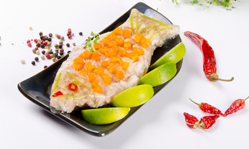 - Nel frattempo, immergete la gelatina in acqua fredda. Pelate le carote e tagliatele a pezzi - questi saranno utilizzati in seguito per decorare il pesce posizionandoli sopra formando il disegno delle squame. Cuocete per 5-8 minuti in acqua salata e poi scolate.