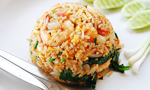 - Cuocere il riso in acqua bollente salata per circa 20 minuti, poi scolare. Sbollentare anche i gamberetti in acqua bollente salata per 2-3 minuti e scolare. Tagliare i gamberetti in pezzi sottili